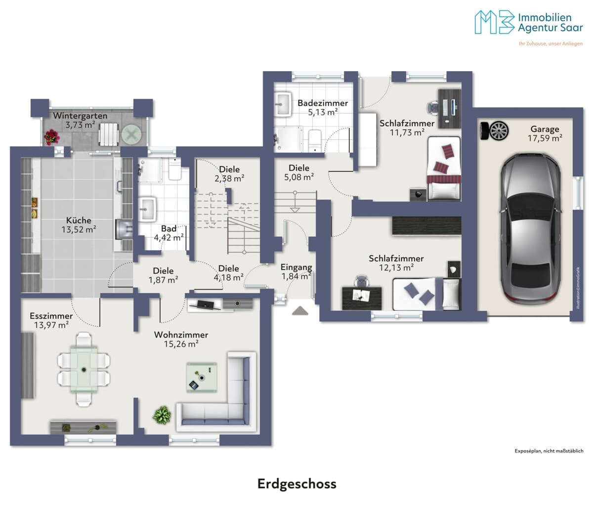 Im Obergeschoss setzen sich die durchdachten Raumstrukturen fort. Drei gut geschnittene Schlafzimmer schaffen Rückzugsorte für die ganze Familie. Ein weiteres Badezimmer sowie ein zweiter Wintergarten, der von einem der Schlafzimmer aus zugänglich ist,