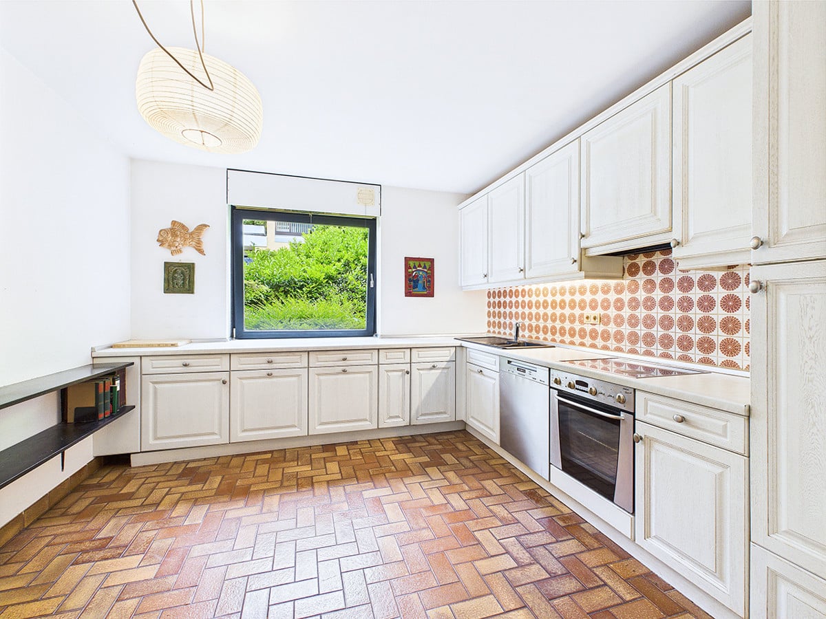 Bodentiefe Fenster durchfluten den Wohnbereich mit Tageslicht und eröffnen den Blick in den Garten. Der angrenzende Küchenbereich ist über die offene Diele erreichbar und bietet Platz für eine Frühstücksecke. Wohn-/Esszimmer und Küche sind ideal miteinander kombiniert, um gemeinsame Kochabende und Verköstigungen mit Familie und Freunden zu genießen.
