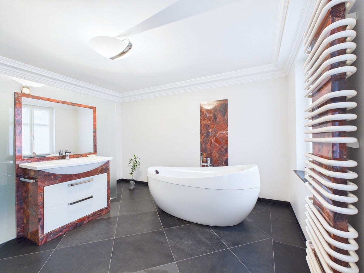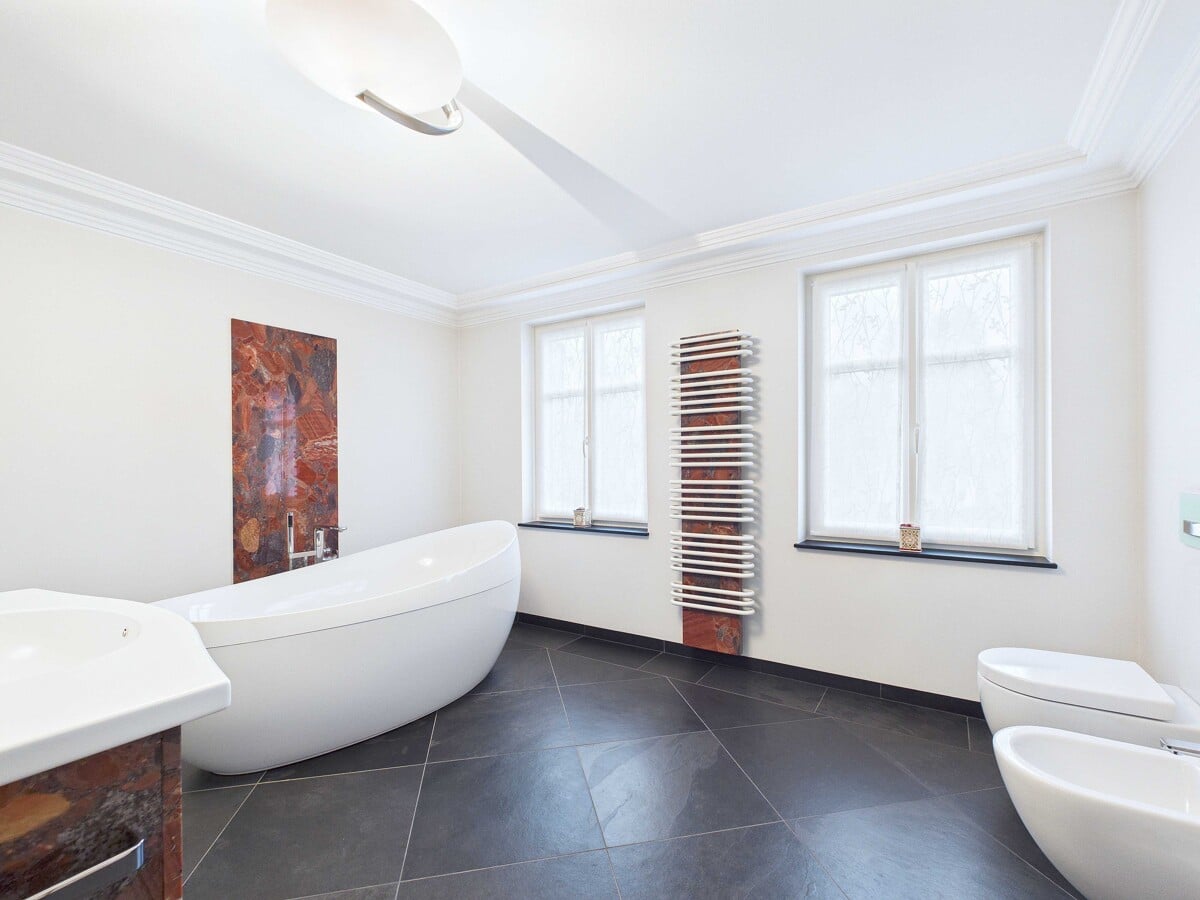 Die freistehende Badewanne, die harmonisch abgestimmte Farbgebung und die elegant integrierte ebenerdige Dusche unterstreichen die Wertigkeit.