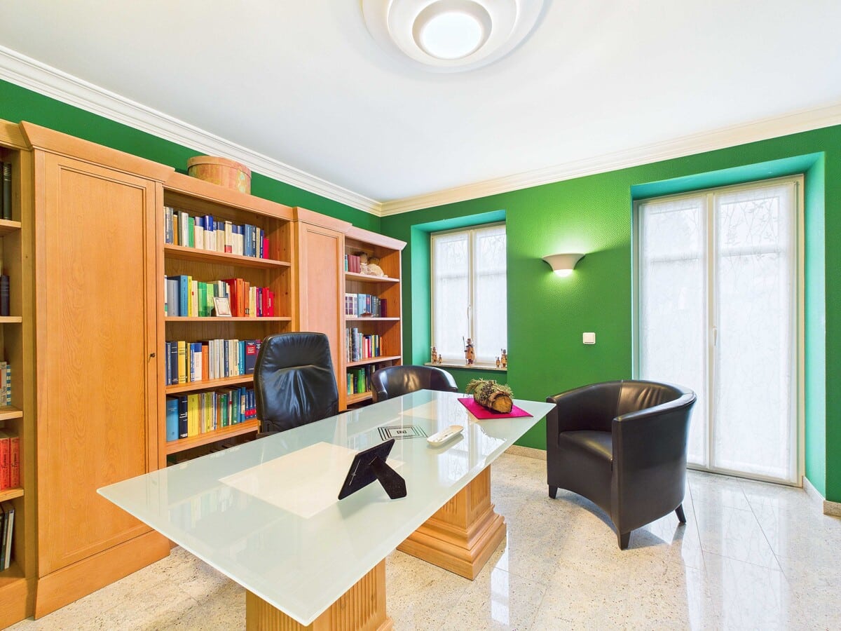 Angrenzend befindet sich das Büro mit Zugang in den Garten. Das gegenüberliegende Schlafzimmer bietet sich als ruhigen, elterlicher Rückzugsort an. Über die freitragende Granittreppe gelangen Sie in die großzügige Diele, die ein Gefühl von Ankommen vermittelt. Der Küchenbereich überzeugt mit durchdachtem Schnitt und verbindet das angrenzende Esszimmer mit dem stilvollen Wohnzimmer. Der Tunnelkamin setzt dabei sowohl gestalterisch als auch funktional einen besonderen Akzent. Der Balkonzugang erweitert den Wohnbereich mit herrlichem Ausblick auf die Umgebung. Großzügige Fenster schaffen ein lichtdurchflutetes Ambiente, der Balkon erweitert den Wohnraum und eröffnet eine herrliche Aussicht zum Verweilen.