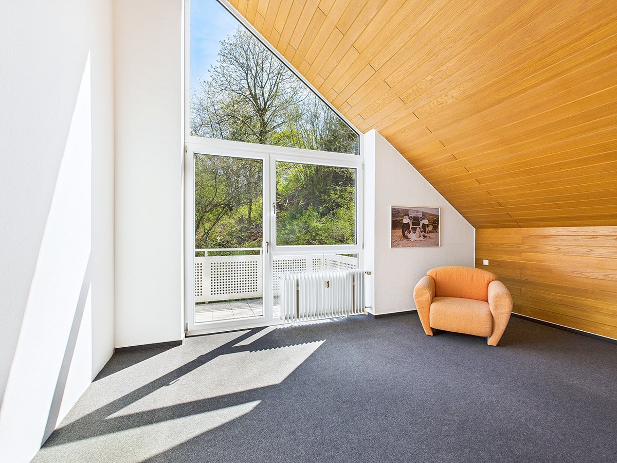 Das Obergeschoss empfängt Sie mit dem großzügigen Wohn- und Essbereich, der Zugang zu dem sonnigen Balkon mit herrlichem Weitblick über die Umgebung bietet. Das ruhig gelegene Schlafzimmer überrascht mit dem zweiten Balkon, der den Raum um eine besondere Rückzugsmöglichkeit im Freien erweitert. Die charmanten Dachschrägen fügen sich harmonisch in die Etage ein und verleihen den Räumen eine behagliche Wohnatmosphäre. Das stilvolle Badezimmer mit Badewanne sowie das zusätzliche Gäste-WC runden das attraktive Gesamtpaket dieser Etage perfekt ab.