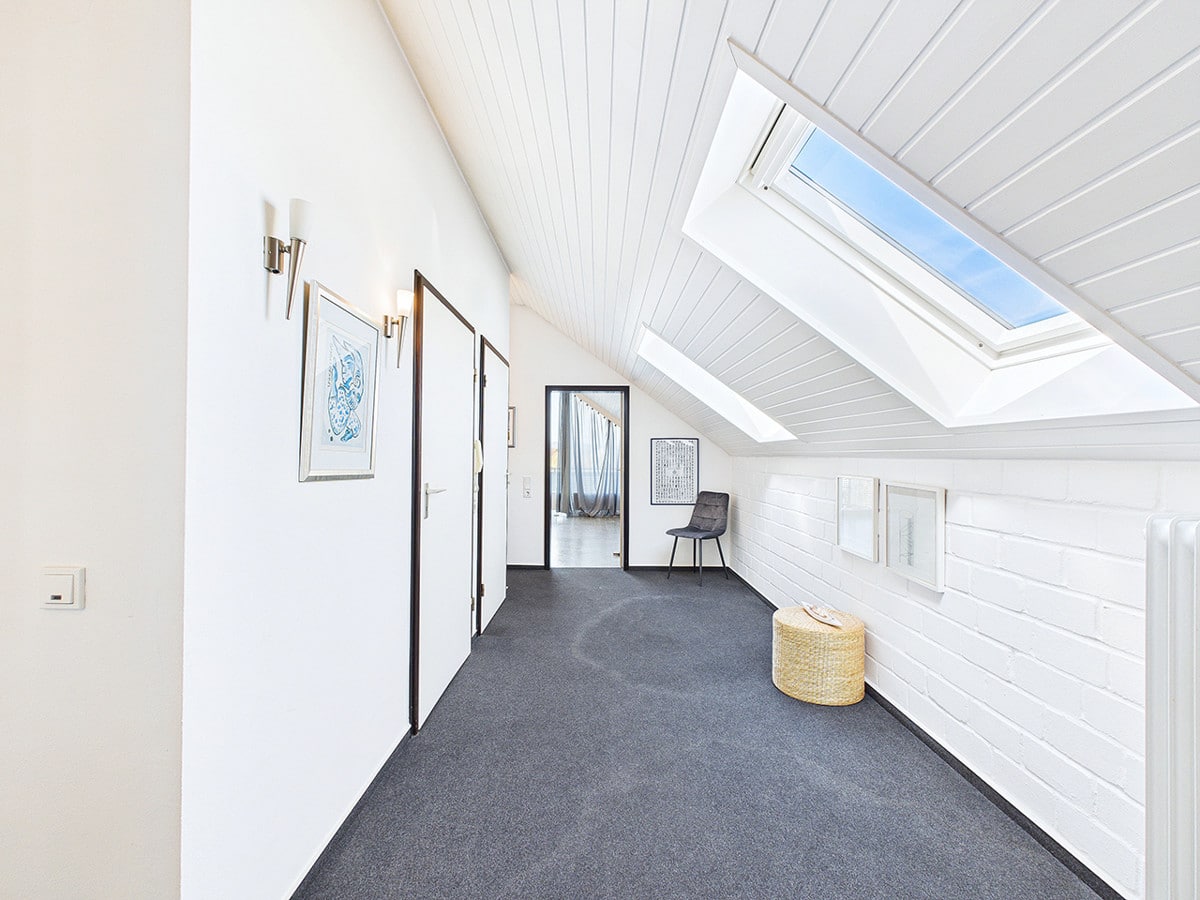 Der anliegende Dielenbereich bietet einen offenen Arbeits- oder Ruheort, der zugleich den weiteren Zugang zur Terrasse eröffnet. Diese Räumlichkeit lädt zu kreativen und erholsamen Stunden ein.