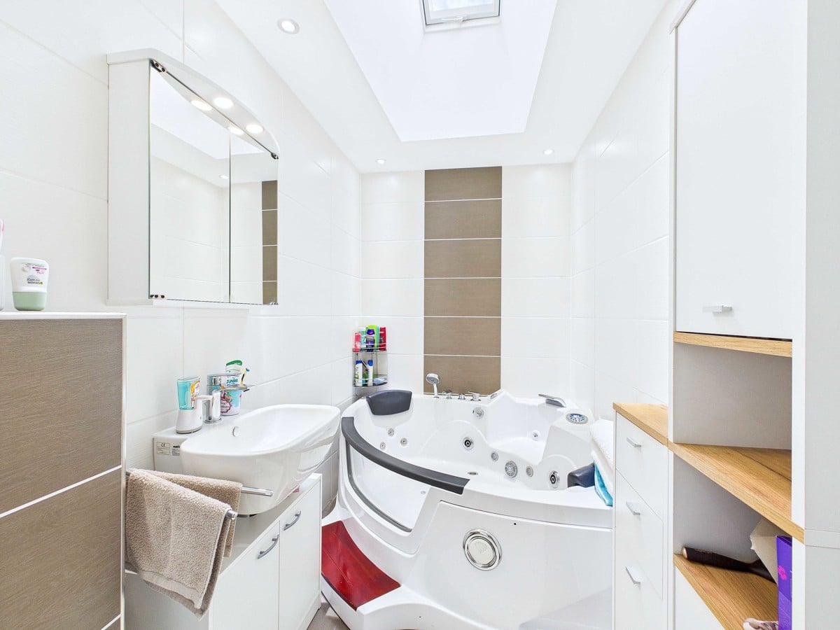 Das Badezimmer ist mit einer Whirlwanne ausgestattet, perfekt für entspannte Auszeiten nach einem langen Tag. .