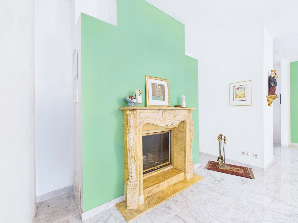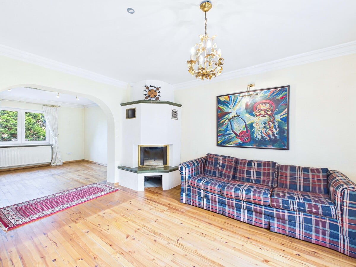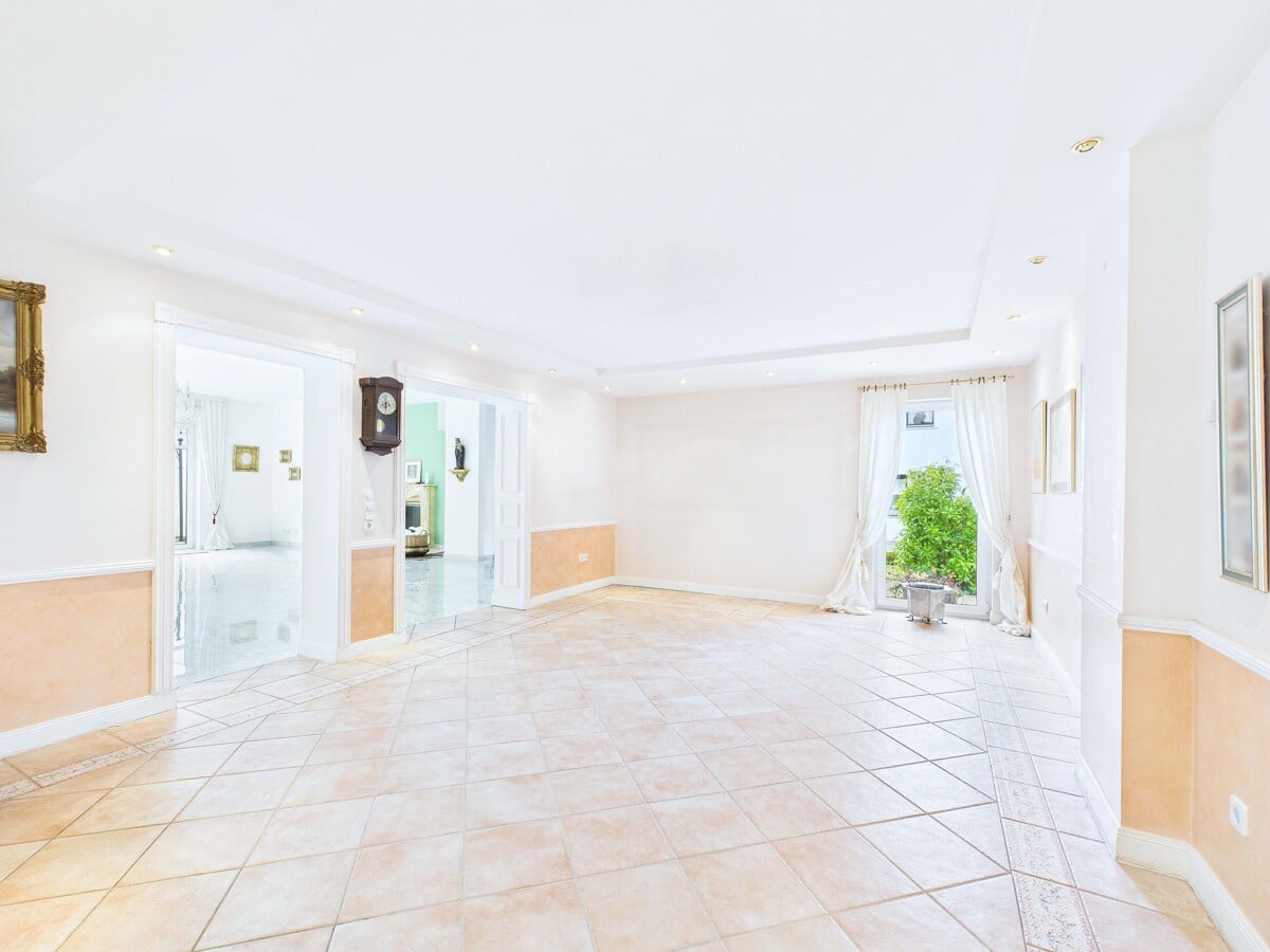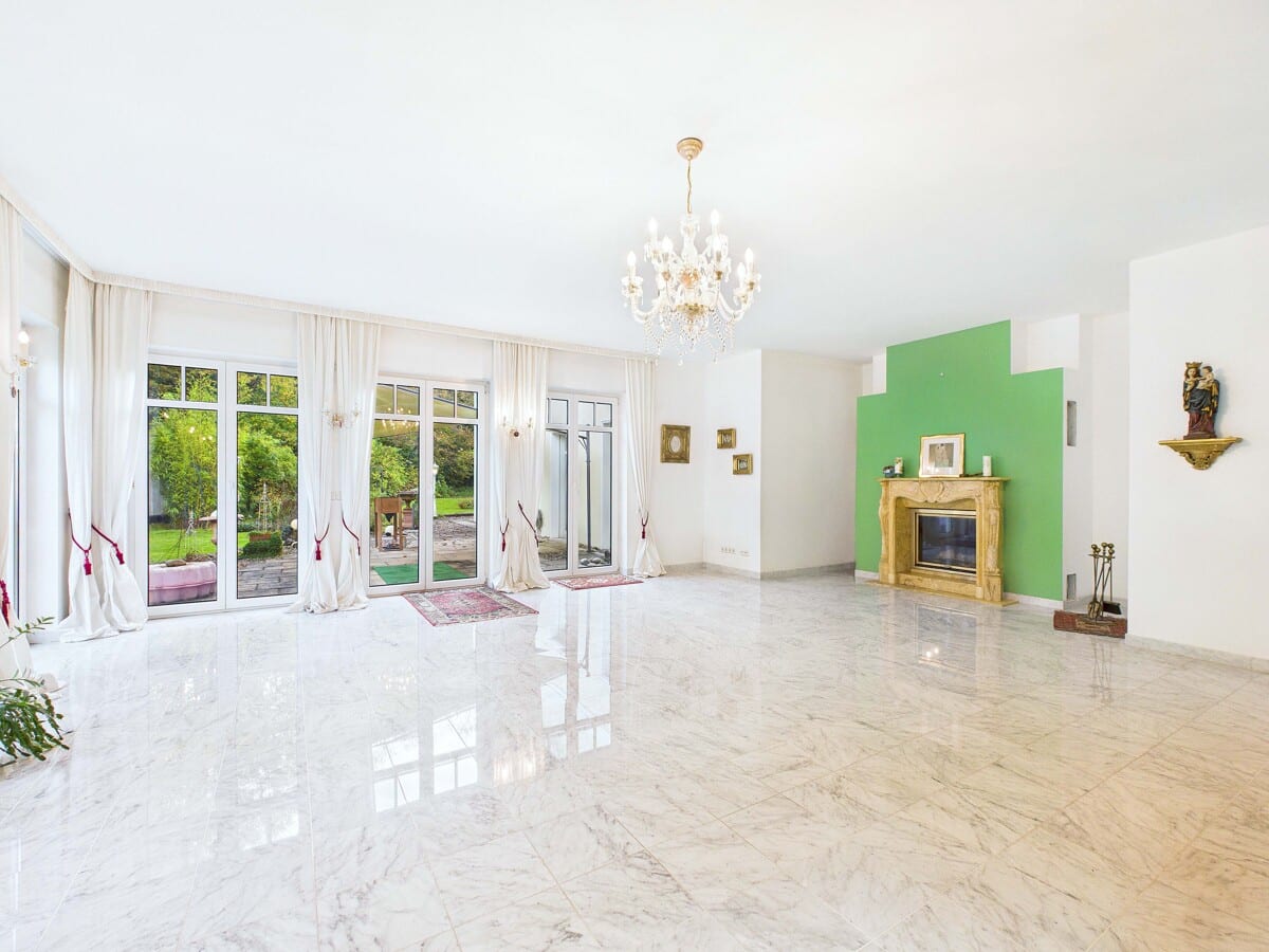 Sie betreten die Immobilie über die offene Diele, die den Blick unmittelbar in das weitläufige Wohn-Esszimmer freigibt. Hohe Decken, edler Marmorfußboden und großzügige Fensterfronten schaffen eine lichtdurchflutete Atmosphäre mit Blick in das prachtvolle Gartengrundstück. Die bodentiefen Terrassentüren führen hinaus auf die Sonnenterrasse, während der Kamin und die Fußbodenheizung im Innern für wohlige Behaglichkeit sorgen. Angrenzend fügt sich das offene Esszimmer harmonisch ein. Weiterführend entdecken Sie einen mit Parkett ausgestatteter Wohnraum, der vielfältige Nutzungsmöglichkeiten offenbart. Ob als Arbeitszimmer, zweites Wohnzimmer oder Kinderparadies, die großzügige Struktur erlaubt individuelle Wohnkonzepte. Der Küchenbereich bietet Platz für kulinarische Ideen. Das Erdgeschoss wird durch ein Gäste-WC und dem Highlight dieser Etage ergänzt.