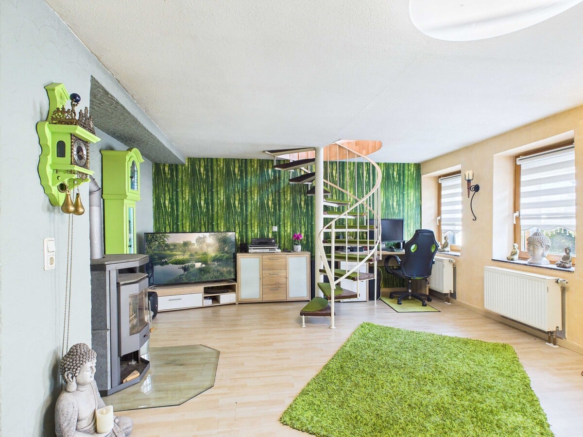 Großzügige Fensterflächen lassen Tageslicht einfallen und unterstreichen die wohnliche Atmosphäre dieser Ebene. Die zentrale Wendeltreppe führt Sie elegant in das Obergeschoss und betont dabei das offene, durchdachte Raumkonzept.