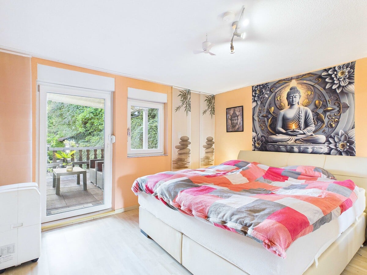 Angrenzend befindet sich das freundliche Hauptschlafzimmer mit direktem Zugang zum überdachten Balkon. Über die vorhandene Treppe erreichen Sie den Gartenbereich.