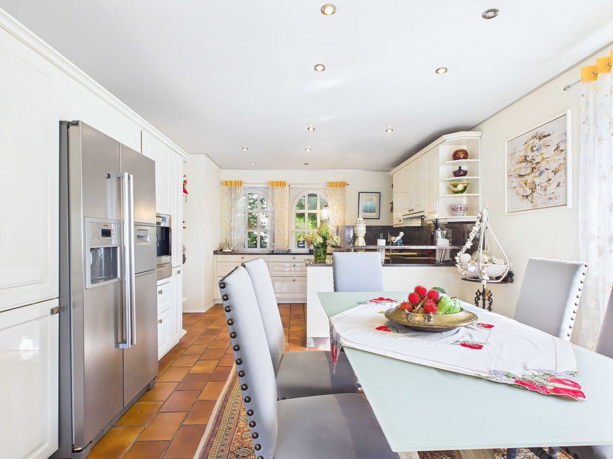 Bereits beim Eintreten in die weitläufige Diele des Erdgeschosses entfaltet sich das wohnliche Ambiente dieses Hauses. Der Übergang in das großzügige Wohn-Esszimmer lässt den Blick unmittelbar über die weitläufige Fensterfront bis in die grüne Umgebung schweifen. Das Parkett unterstreicht die warme Atmosphäre, während sich der Raum dank seiner Weite sowohl für gesellige Abende als auch für stille Momente eignet. Der offene, angrenzende Küchenbereich mit integriertem Essplatz ist harmonisch in das Raumkonzept eingebettet. Lichtdurchflutet und gut proportioniert bieten diese Räume einen Ort für gemeinsame Mahlzeiten, Gespräche und familiäre Rituale. Die Nähe zum Wohnbereich ermöglicht einen offenen Austausch.