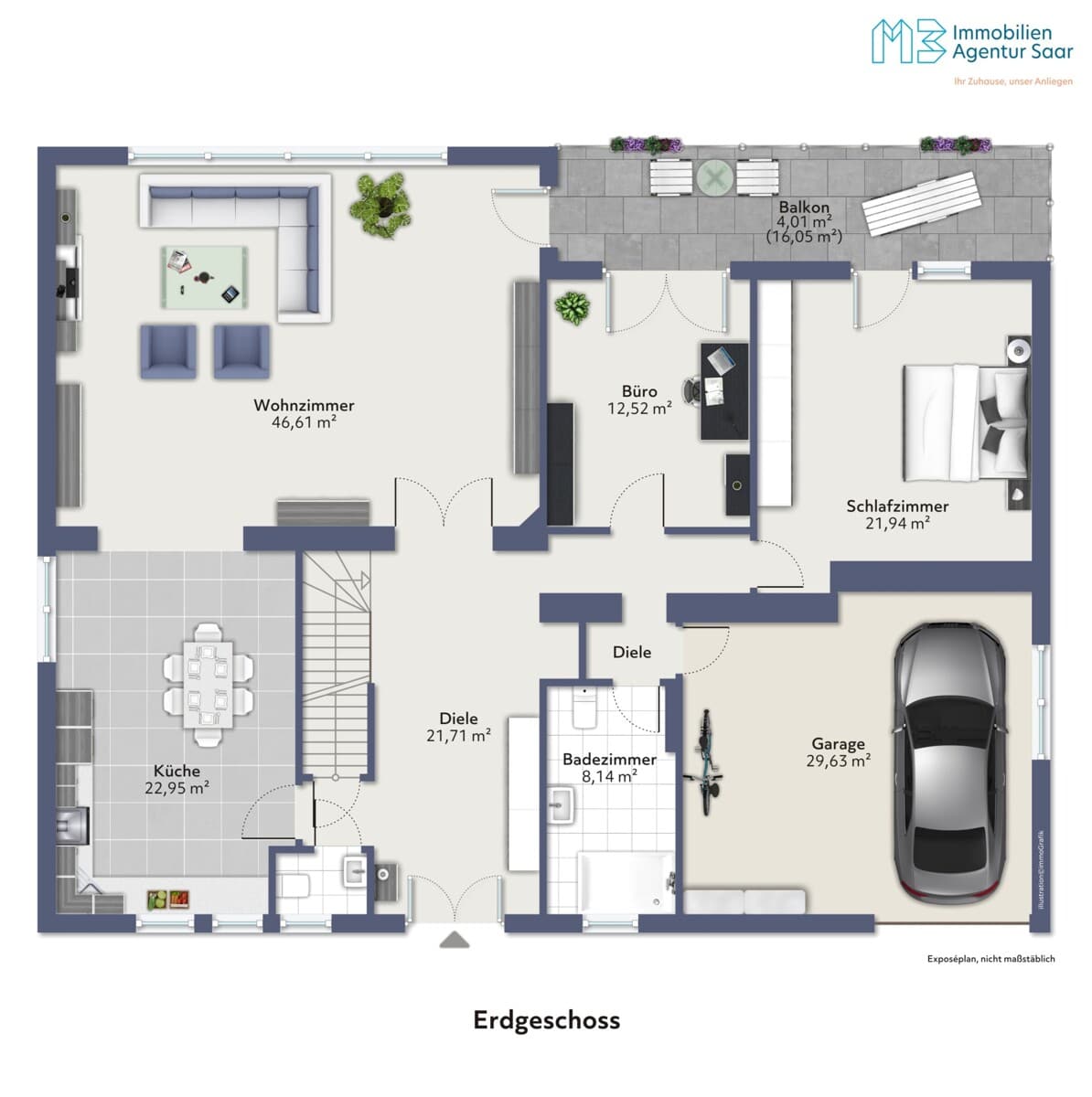 Die Autobahn A1 erreichen Sie in wenigen Fahrminuten, die A620 liegt ebenfalls gut erreichbar und verbindet Sie schnell mit dem gesamten Saarland.